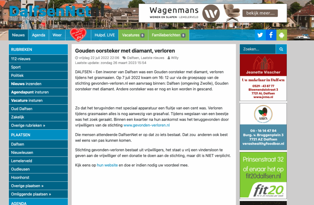 DALFSEN – Een inwoner van Dalfsen was een Gouden oorsteker met diamant, verloren tijdens het grasmaaien. Op 7 juli 2022 kwam om 16: 12 uur via de groepsapp van de stichting gevonden-verloren.nl een aanvraag binnen: Dalfsen (omgeving Zwolle), Gouden oorsteker met diamant. Andere oorsteker was er nog en kon worden in gescand.