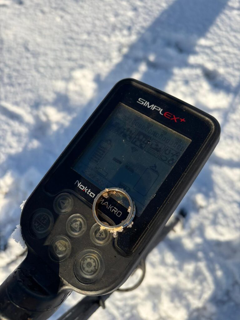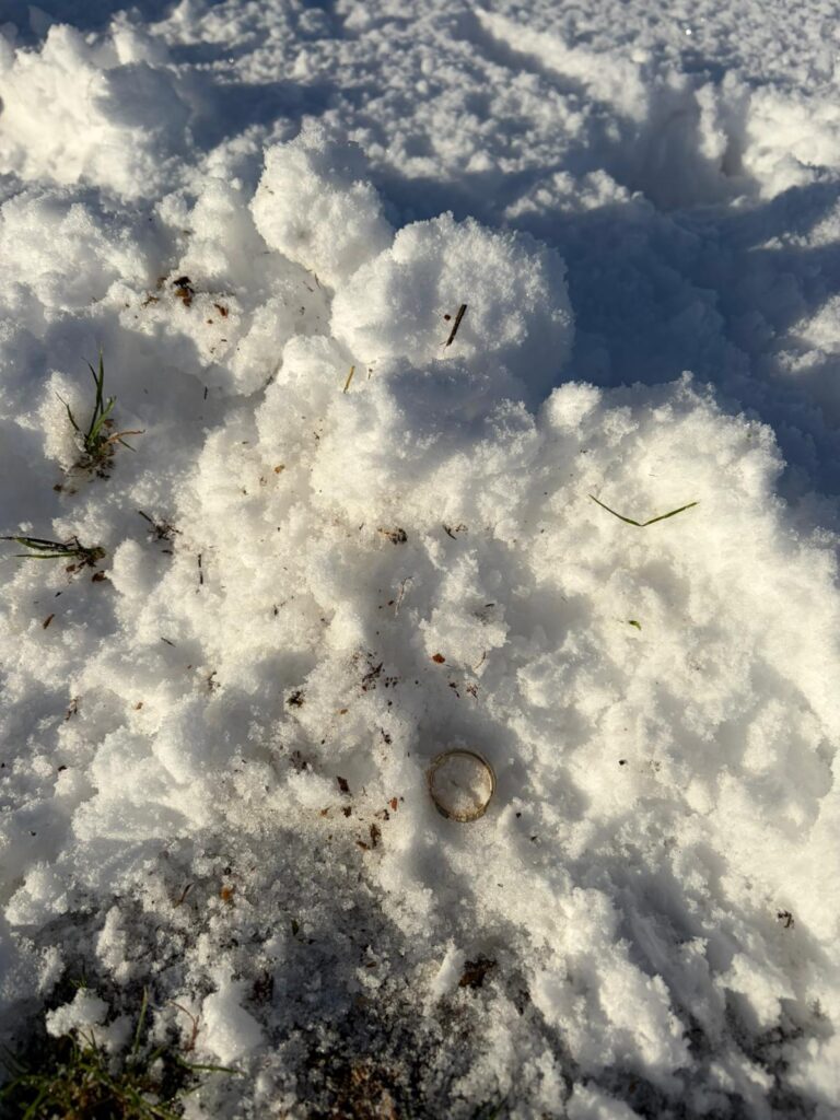Patrick heeft zich hier volledig voor ingezet en met veel professionaliteit en geduld de ring met zijn metaaldetector opgespoord – en gevonden, midden in de sneeuw.